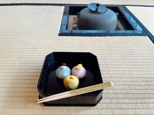 ひな祭りの趣向でお茶会体験会をしました。お雛様を模した和菓子と床の間には桃の花を。 面白いご感想「濃茶はビリジアン!?」