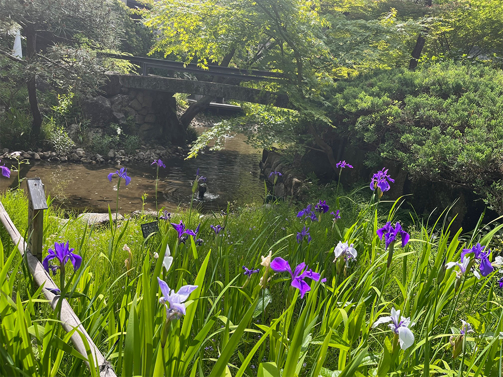 庭園の池のほとりには、さまざまな色の菖蒲が咲き、葉の緑に映えて清々しい様子で目から楽しませてくれています。
