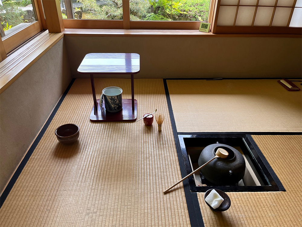 風炉になると、釜は写真の左側に移動し、お客様から遠くなるため涼しく過ごしていただけるようになります。